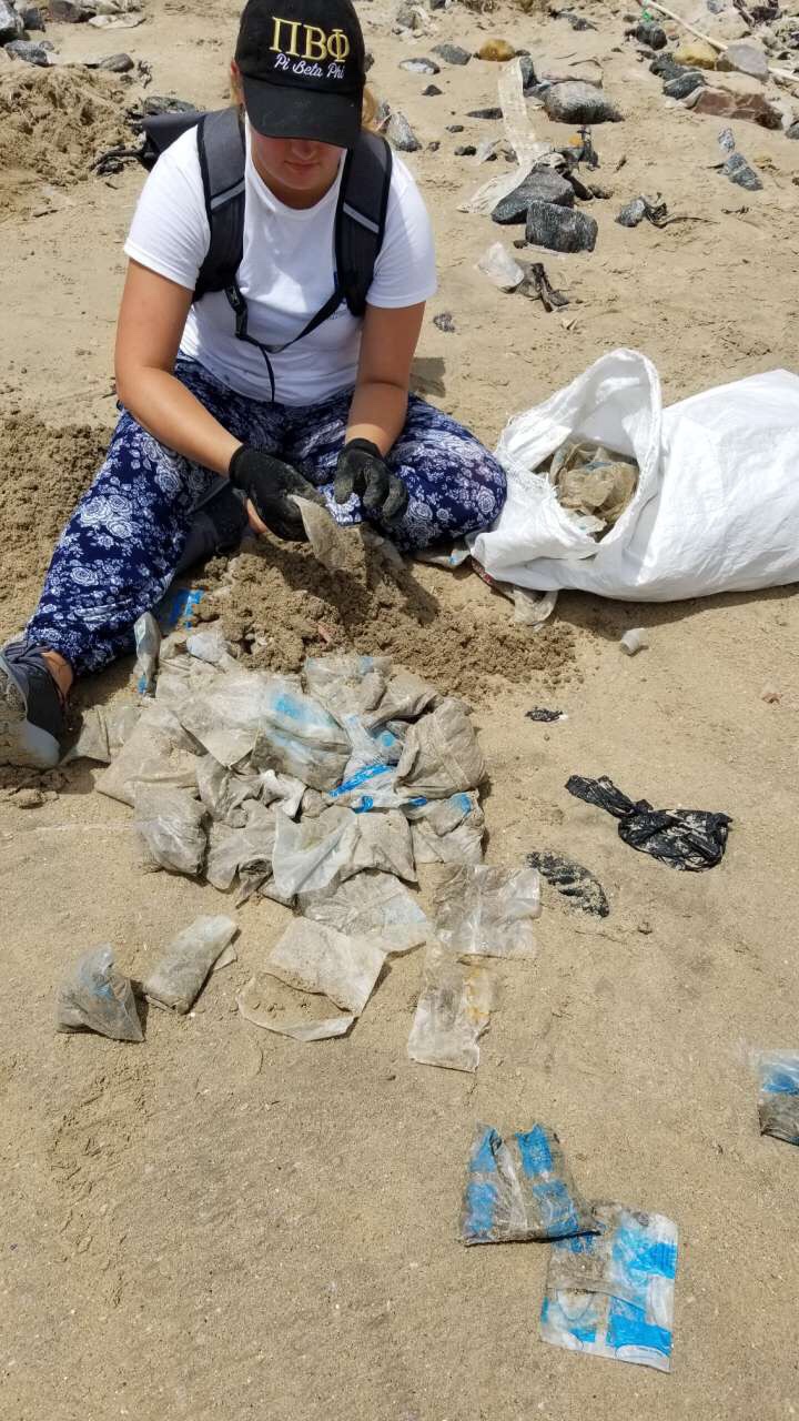Day 1- We arrived into port around 0630. I’m not exactly sure when because I woke up to the sound of us docking. We were told we were getting in at 0730, but we arrived early. I had a field program called “Trashy Bags” Social Enterprise Project. We were supposed to depart the ship at 0900, but the ship took longer to get cleared than expected so we ended up departing closer to 0930. We headed to a beach near the Regional Maritime University in order to have a two-hour beach clean-up through an organization called Plastic Punch. Plastic Punch basically works towards promoting environmental cleanliness and educating people, as well as finding eco-friendly disposable options. Each person chose a different item to pick up on the beach. The most common things were plastic bottles, trash bags, shoes, and “sachets”, which are the small bags of water that contain the drinking water for people. I choose to pick up the sachets because there were so many. These baggies, which normally had a little hole ripped in them so a person could drink water from it, had so much sand in them. Some of the bags were completely full of sand and I couldn’t find the hole that it got in so we would have to rip the bags open to dump it out. There was also this biggest compilation of fabrics twisted together that I tried to get out with the help of four other people, and we ended up not being able to get it fully loose. I was covered in sand to my shoulders and my shirt was soaked through with sweat, but the two hours went by so fast it only felt like we had been cleaning for 45 minutes. We collected 9029 sachets, 4247 plastic bottles, 281 textiles, 406 shoes, and more in our group of 34