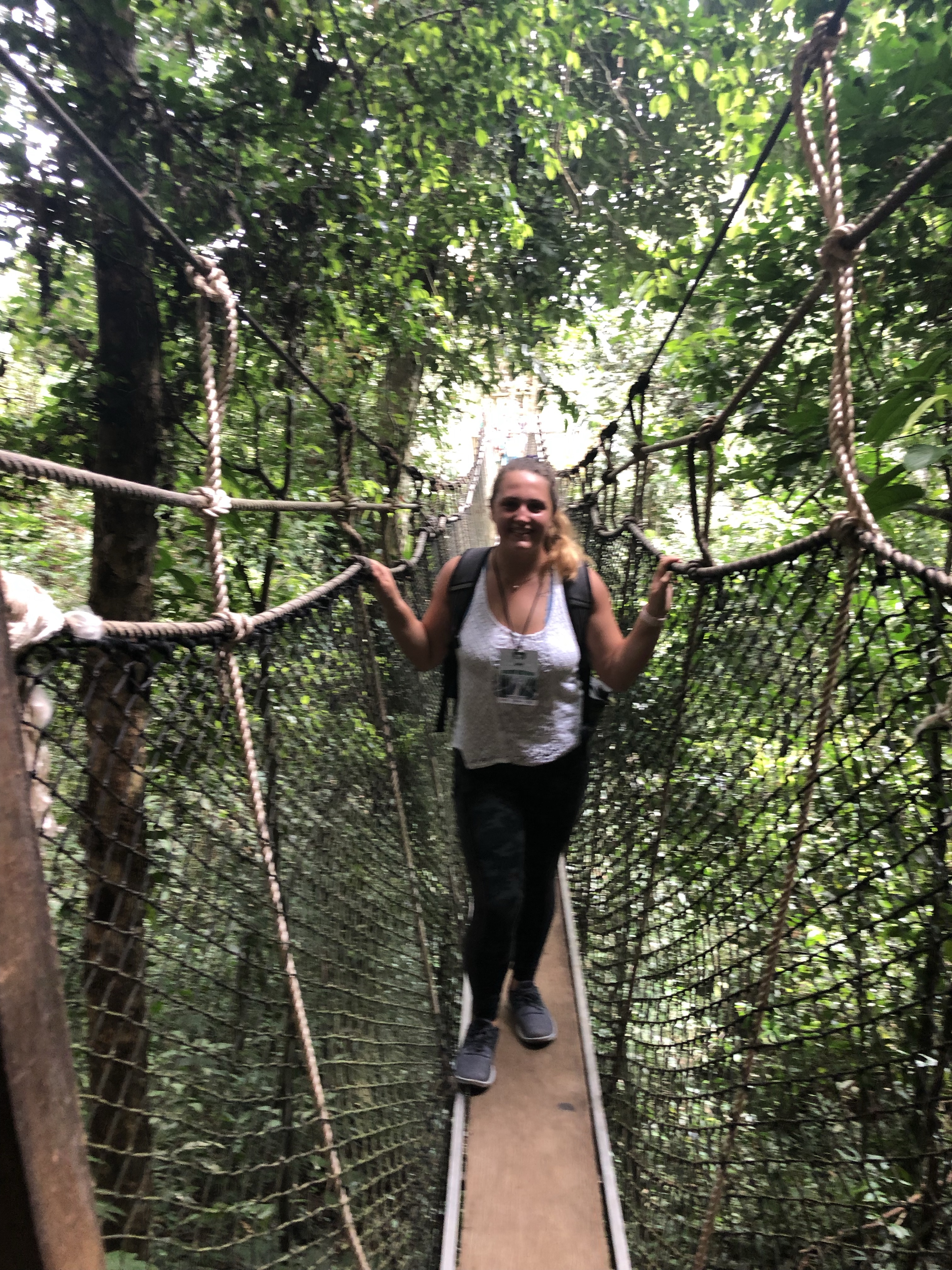 Day 4- My last field program of Ghana awaited me on the fourth day. I had a lot of my good friends with me and my roommate was able to get on through stand-by. For this one, we left for the Kakum National Park around 0800. It was about a two-hour drive from our port in Takoradi. I was able to sleep a little, but not more than a half an hour. We arrived at the park around 1000. From there, we split into two groups for the canopy walk. I was in the first group and we started on our way. We took a few breaks along the way since it was mostly uphill to the canopy. Our guide told us that the park is home to monkeys, elephants, birds, and more. Another thing we were told is that there are many snakes in it, and they don’t trim the park’s trees because that would be disturbing the homes of the snakes in the trees. In total, the whole walk only took about an hour. The canopy itself was really cool. We went in groups of five across it. It was about as stable as a suspended bridge with rope can be. There was some netting underneath and rope sides that you could hang onto. I tried to not use hands a few times, but it was so difficult to balance on most of them. It depended how stable the people on with you were. It took maybe ten minutes to get through all the canopies and I was in the first group, so we sat and waited (and cooled off) while the other groups went through.